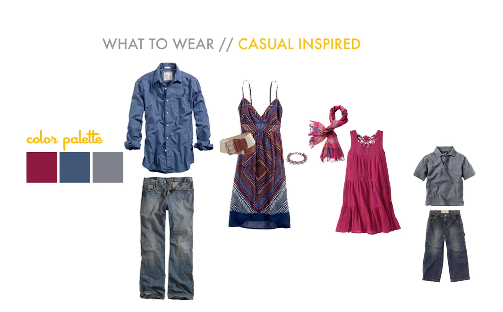 You want clothing/colors that coordinate but are not “matchy matchy”. I usually suggest choose 2 colors that coordinate with each other and then you can mix in black, white, gray, khaki, even brown sometimes. Layers on women are always nice and flattering. Feel free to send me some images of outfits you are considering and I can help you make some decisions!